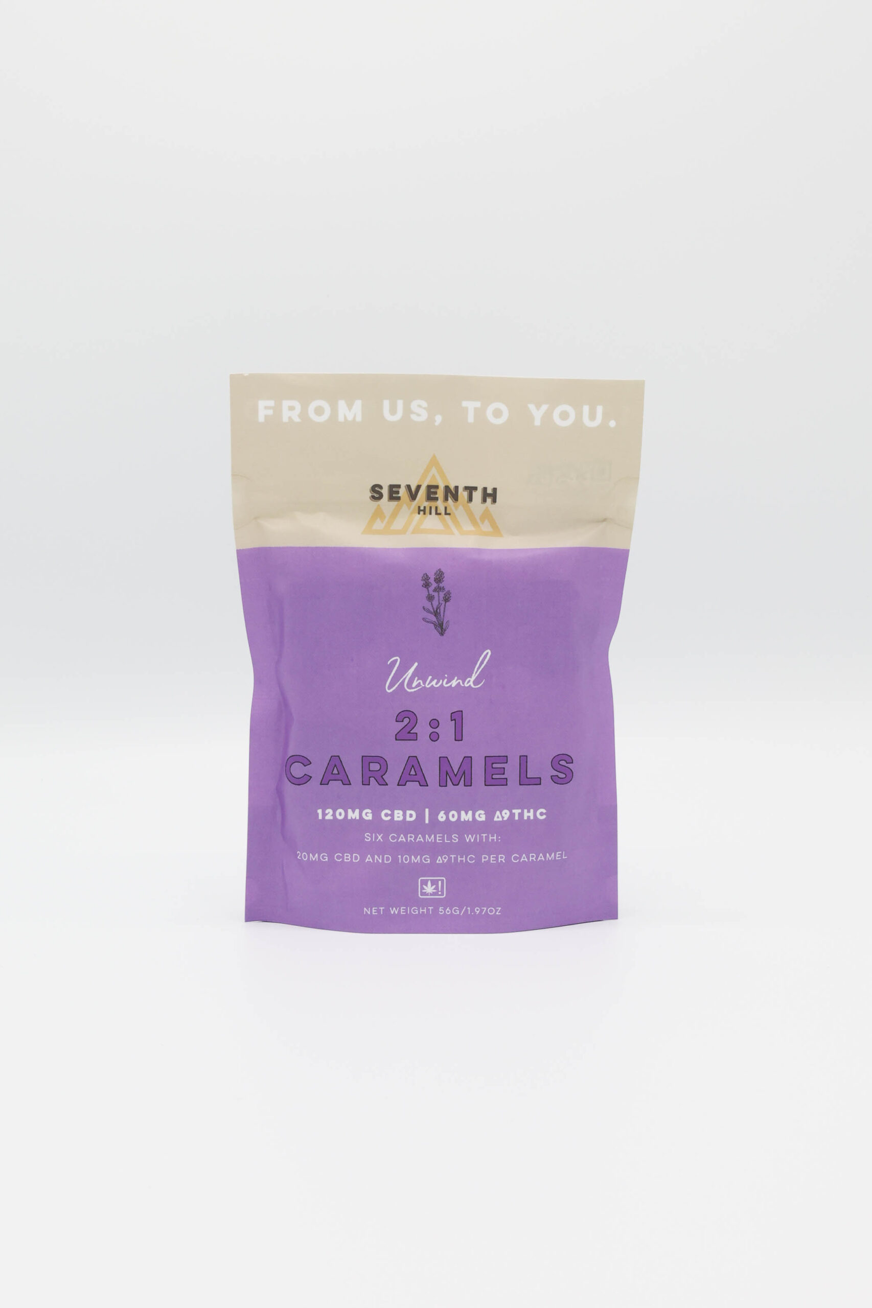 The 2:1 Unwind Caramel is a CBD dominant full spectrum indica edible. This indica caramel has two times as much CBD as THC. A 2:1 CBD:THC ratio has a unique full-body-buzz that doesn’t feel cloudy or overwhelming. With twice the amount of CBD as THC, this edible is great for those looking to keep their mind sharp and their body relaxed. The relaxing terpene blend makes this 2:1 indica caramel perfect for unwinding after a long day. Each piece contains 20mg of CBD, 10mg of ∆9THC, and features a relaxing indica terpene profile.