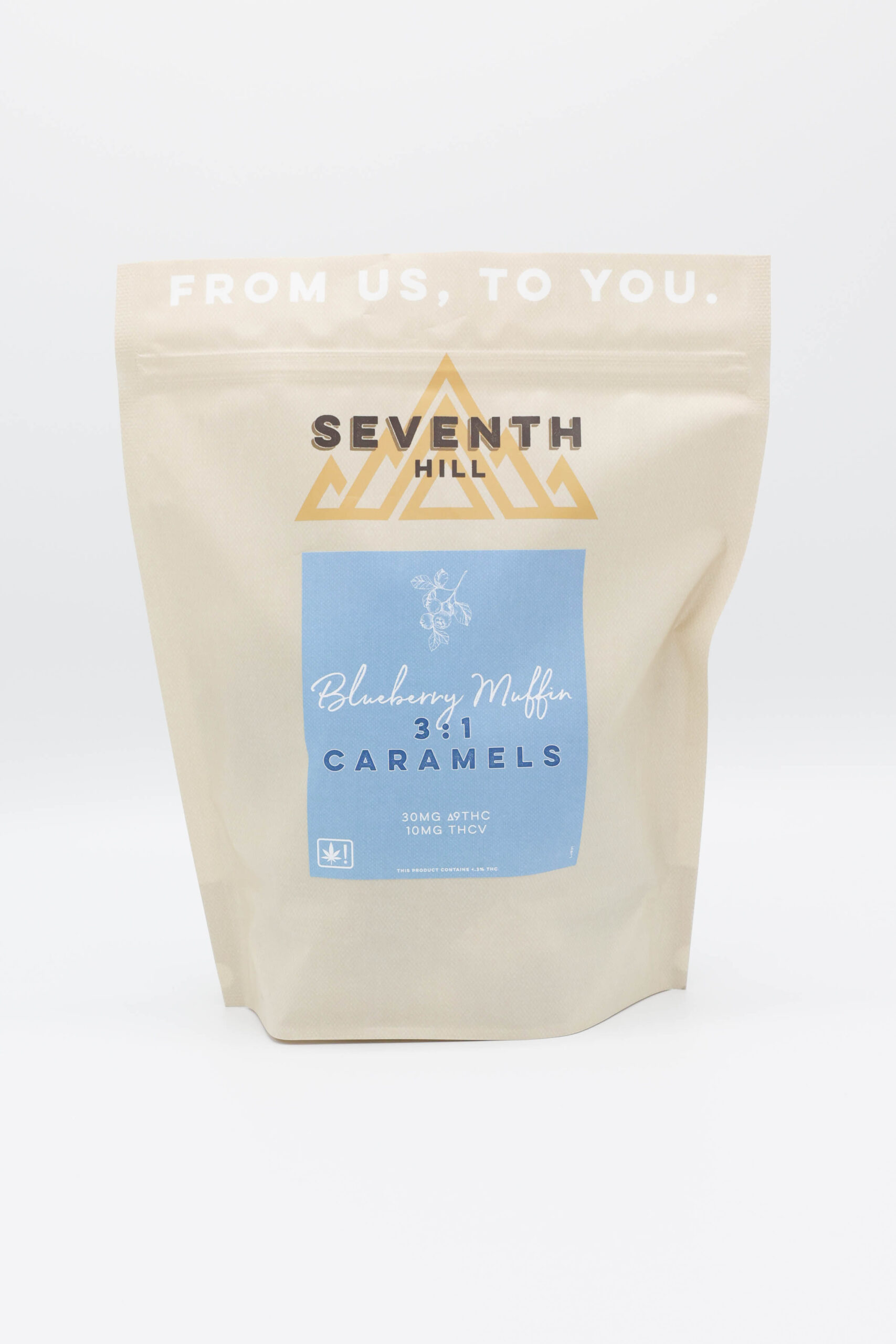 Seventh Hill’s 3:1 Blueberry Muffin Caramels are sweet and comforting like a fresh baked pastry. This high THC edibles has a unique cannabinoid ratio with THC and THCv all packed into one piece. Our 3:1 THC:THCv caramel has effects similar to our other 3:1 caramels, but more clear-headed and less heavy on the body. Each piece of our 3:1 Blueberry Muffin Caramel is packed with 30mg of ∆9THC and 10mg of THCV, plus natural blueberry flavoring.