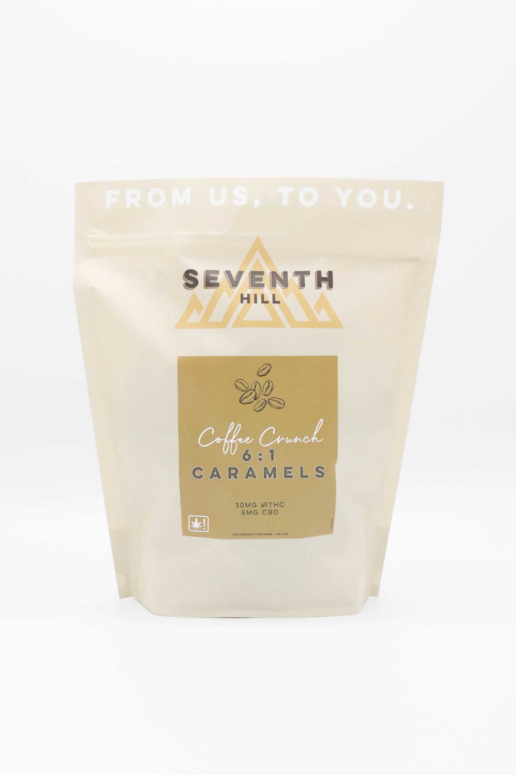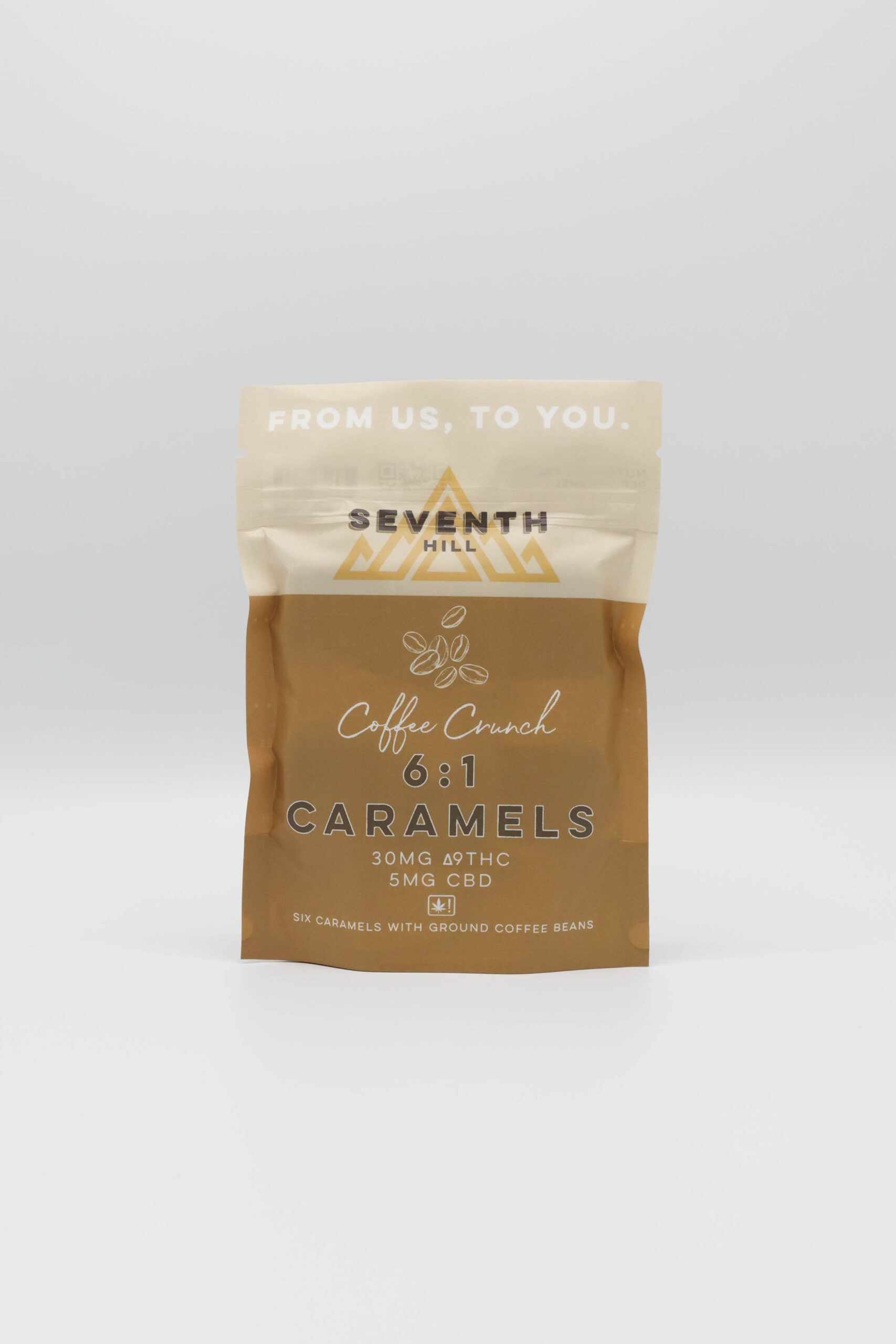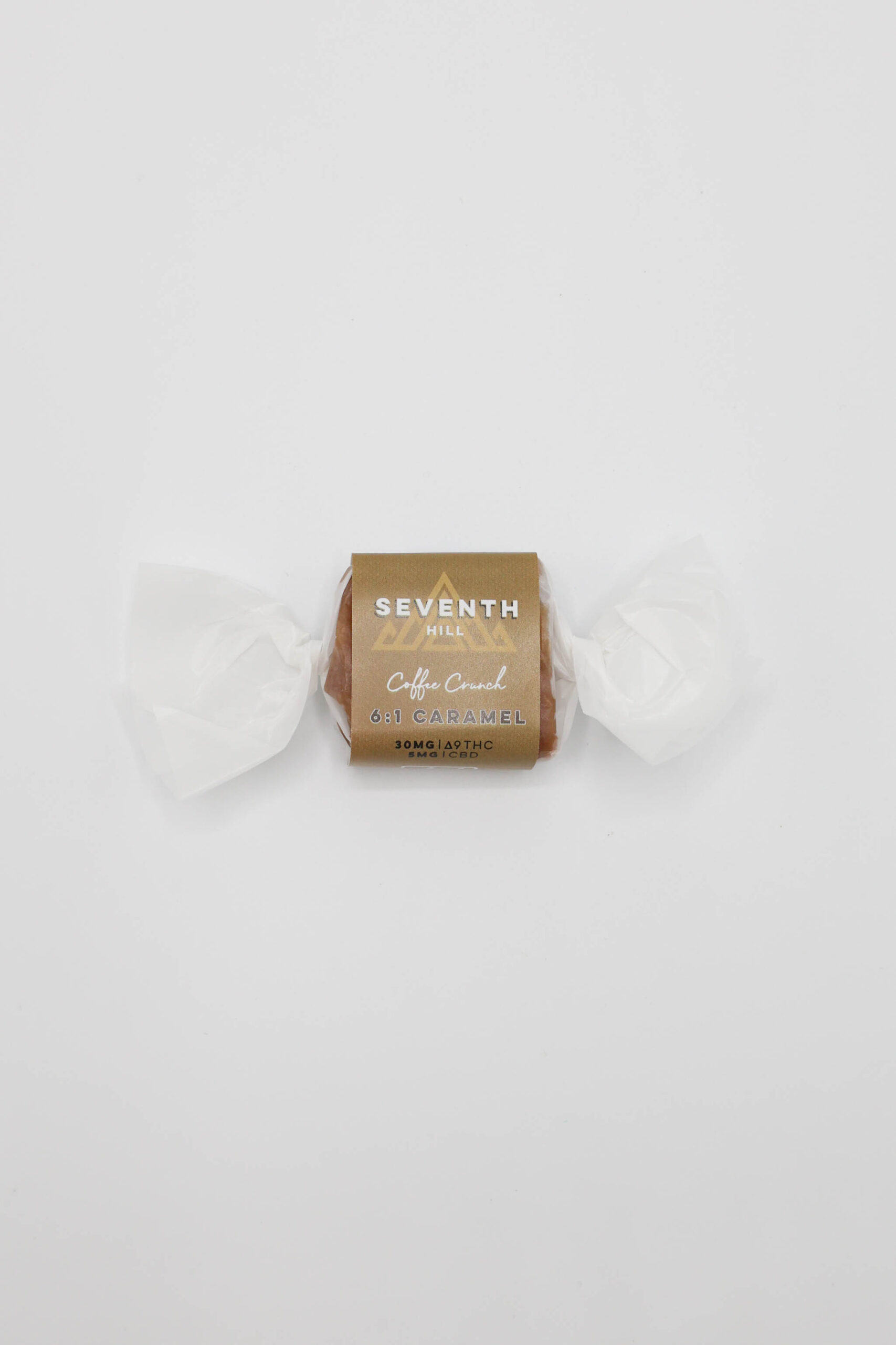 Seventh Hill’s 6:1 Coffee Crunch Caramel combines chewy and crunchy in the best kind of way. Using our classic caramel recipe with freshly ground coffee beans in each bite, this coffee caramel is sweet, savory, and delicious. With high THC and just a touch of CBD, this edible is all gas with just a little bit of breaks. Each piece of our 6:1 Coffee Crunch Caramel is made with 30mg ∆9THC and 5mg CBD, plus freshly ground coffee beans.