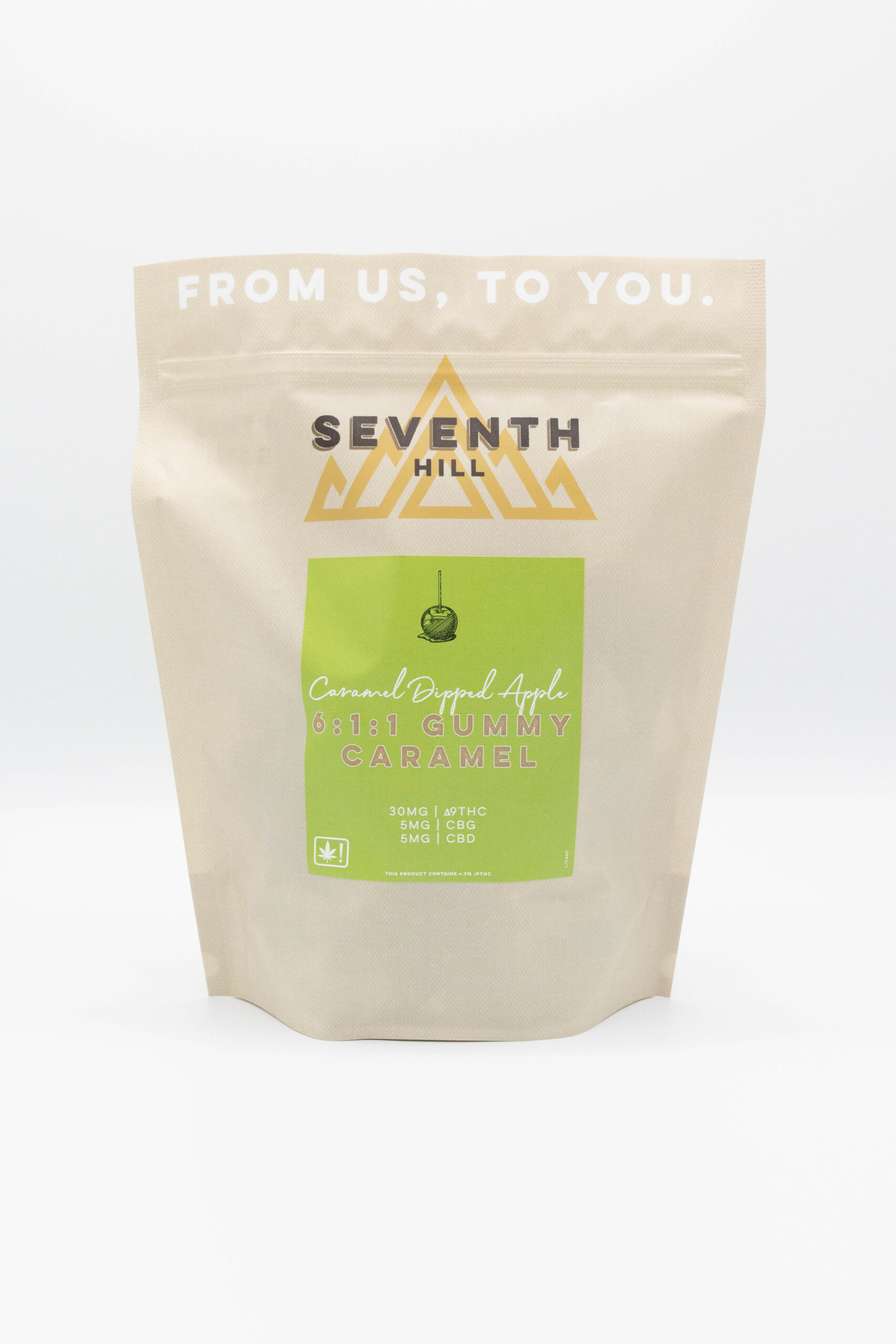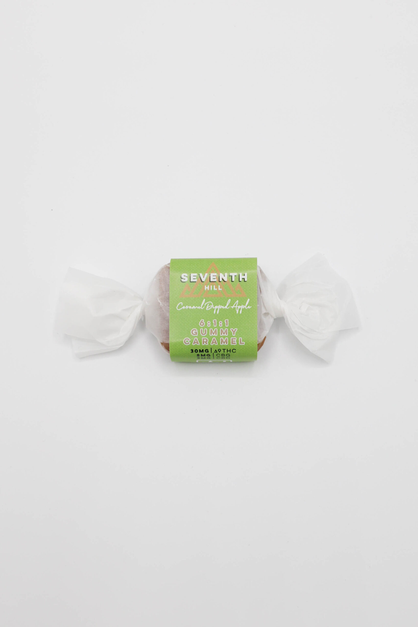 Seventh Hill’s Caramel Dipped Apple Gummy features an infused apple gummy tucked nestled a piece of our delicious salted caramel. It’s like the caramel apple sucker from childhood, but even better. Besides the most satisfying bite in the world, this unique edible provides the same classic results. With high THC content, this edible has significant effects on the body paired with the softening effects of CBD and the clarifying effects of CBG. Each piece of our 6:1:1 Caramel Dipped Apple Gummy is crafted with 30mg ∆9THC, 5mg CBD, and 5mg CBG for a true full-spectrum edible experience.