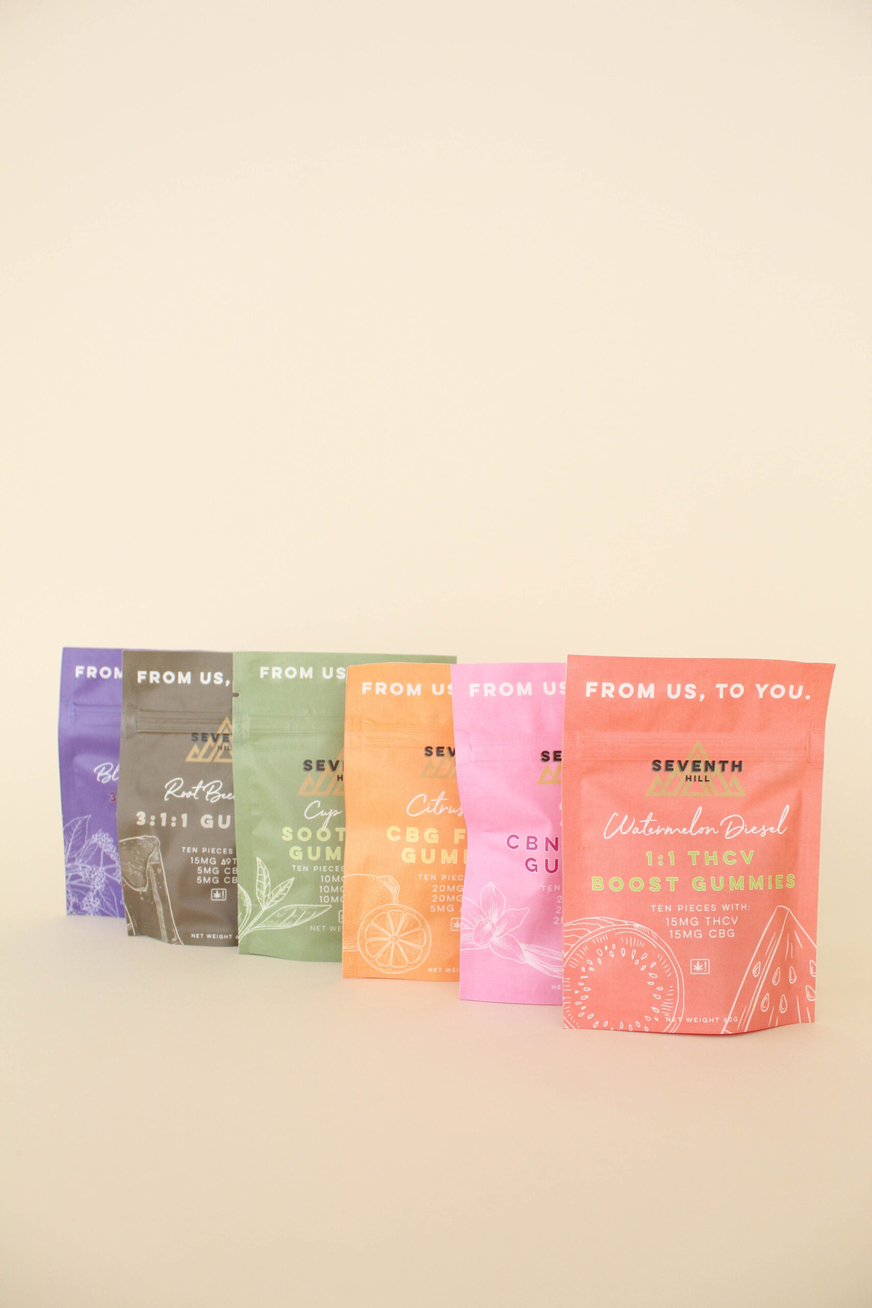 Seventh Hill’s gummies are enhanced with botanical terpenes, naturally flavored, and potent af. From CBN for sleep to high THC sativa gummies, our vegan friendly gummies are for everybody.